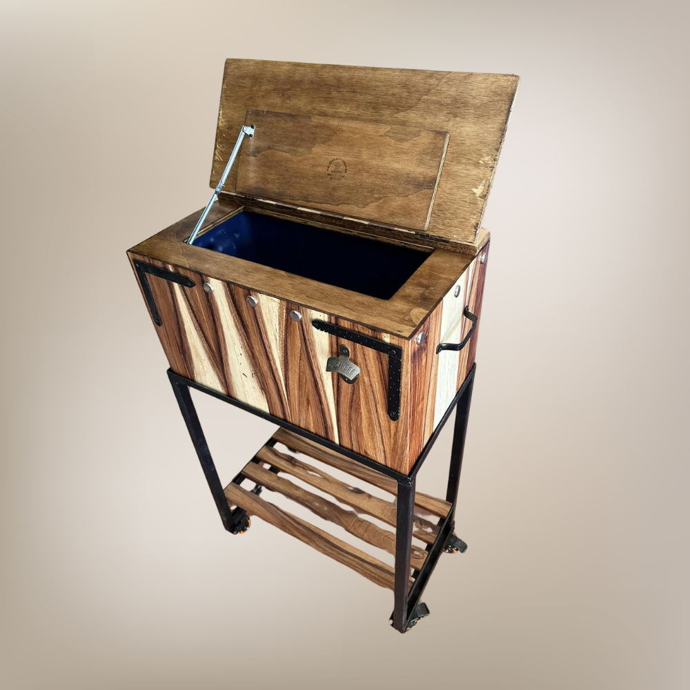 Hielera de 30L en madera fina con base metálica. Diseño liso, elegante y artesanal. Ideal para eventos. Mantiene tus bebidas frías por más tiempo.